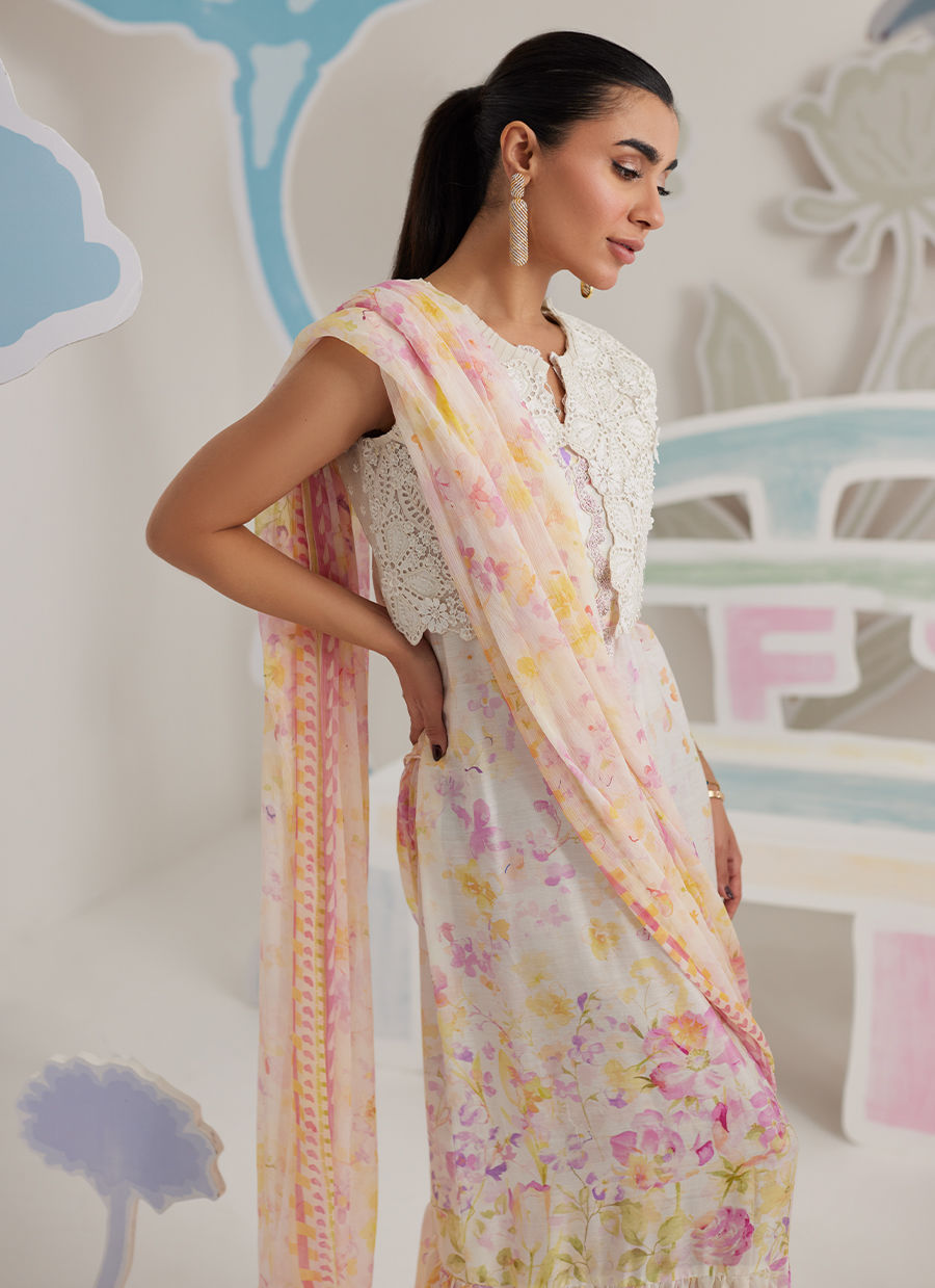 Light, fluid, and effortlessly graceful, Airelle Bloom is designed for moments that call for ease with elegance. A soft floral-printed base flows gently into a flared hem, creating natural movement with every step. The look is elevated with a delicate lace overlay bodice that adds texture and quiet refinement, while the draped dupatta brings a soft, romantic finish to the silhouette.