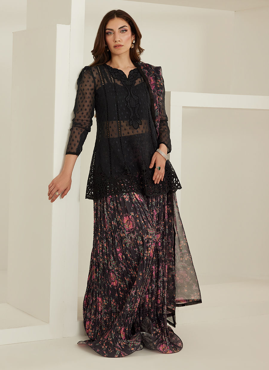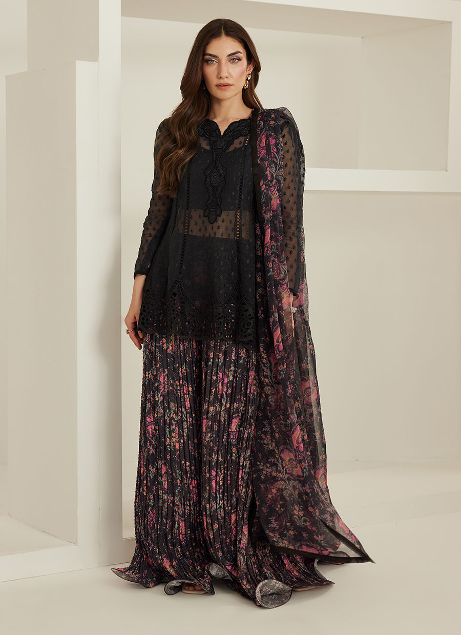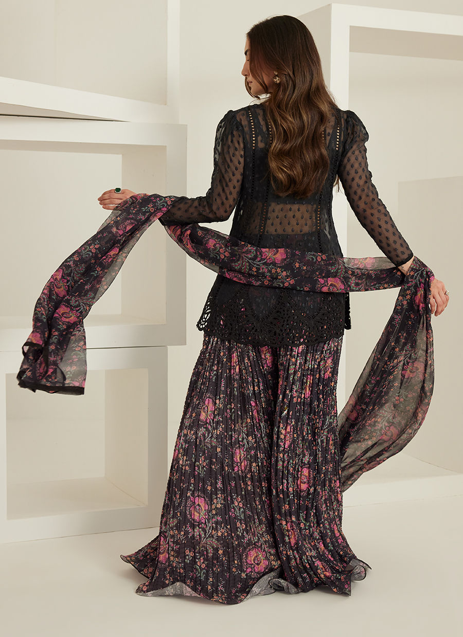 Black Organza Peplum, Pure Khaddi Silk Crushed Pants, Pure Chiffon Printed Dupatta