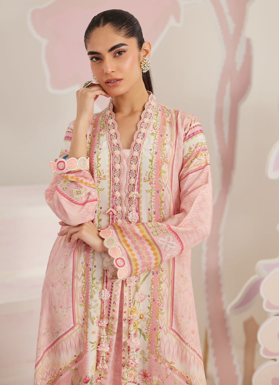 The gentle play of pastel florals and borders enhances the kaftan’s natural fall, making it a versatile choice for festive occasions where comfort and sophistication go hand in hand. Easy to wear yet thoughtfully detailed, Aurette is a statement piece that feels composed, graceful, and unmistakably elevated.