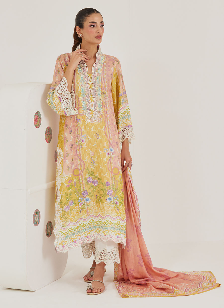 The neckline is intricately detailed, drawing attention with its fine craftsmanship, while the flowing silhouette creates an effortless sense of grace. Lace accents along the sides and hem add a touch of femininity, bringing texture and movement to the design. Paired with a lightweight dupatta that drapes softly, the look feels airy, radiant, and beautifully composed.
