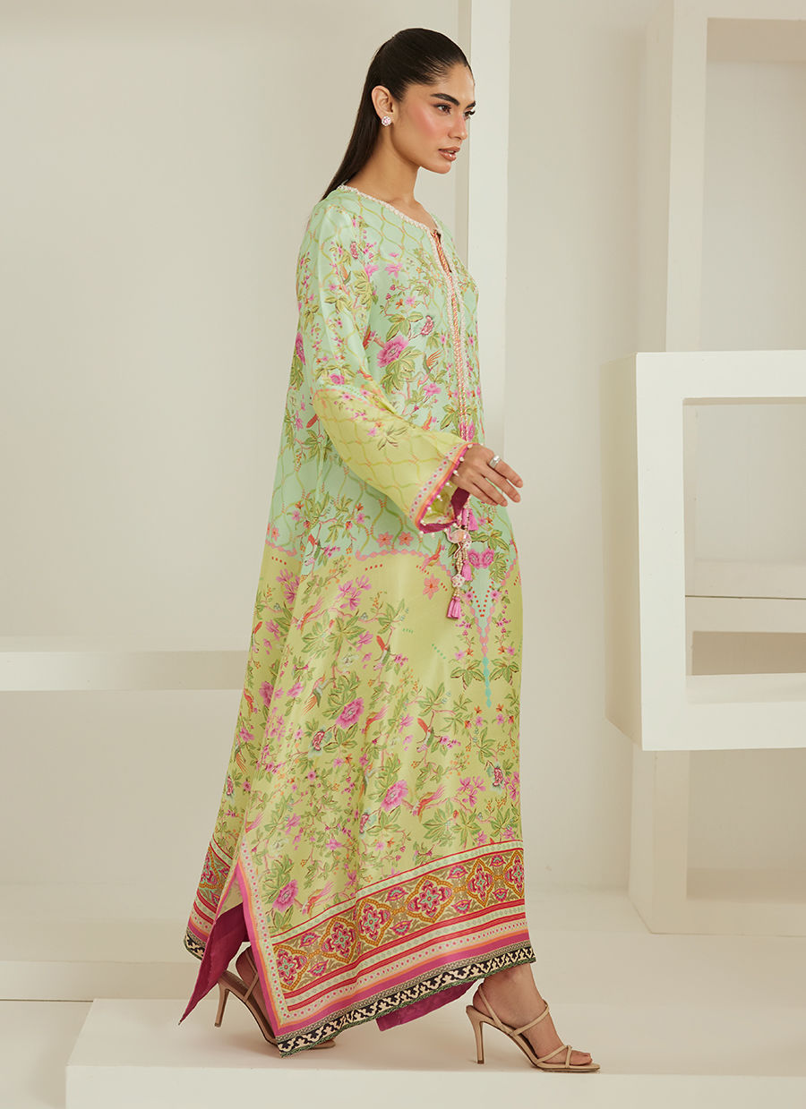 A delicate interplay of color and craft, Carrisa captures the essence of effortless femininity. Rendered in pure raw silk, the silhouette flows with quiet grace, adorned with a vibrant floral print that blooms across a soft mint canvas, touched with hues of blush, rose, and sunlit yellow.