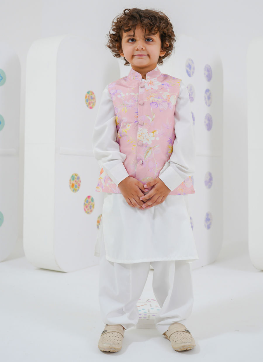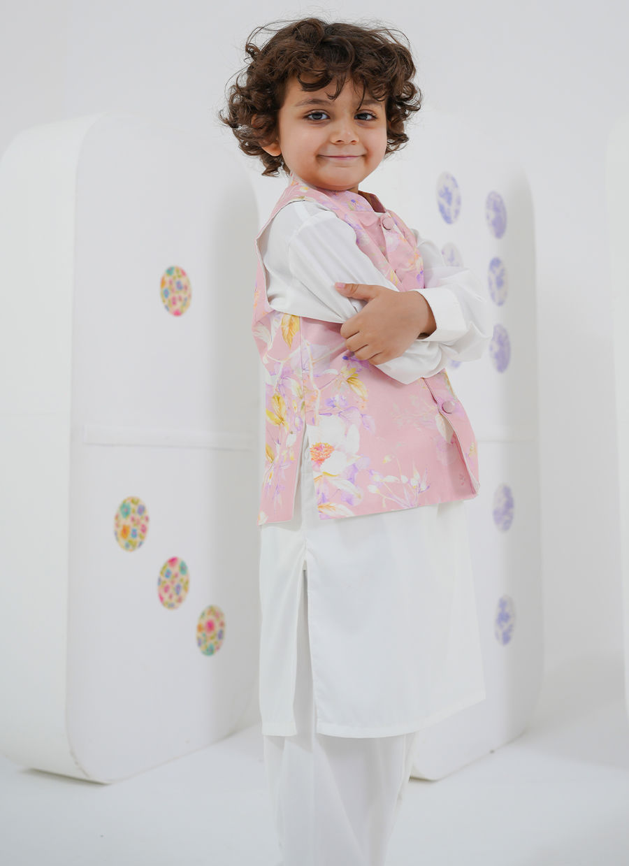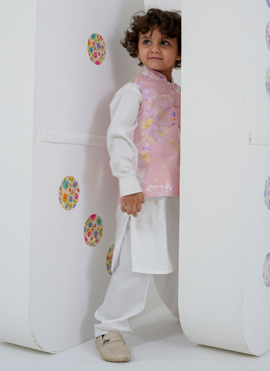 A charming counterpart to Cressida Mini, this boys’ set features a soft floral printed waistcoat layered over a classic kurta.