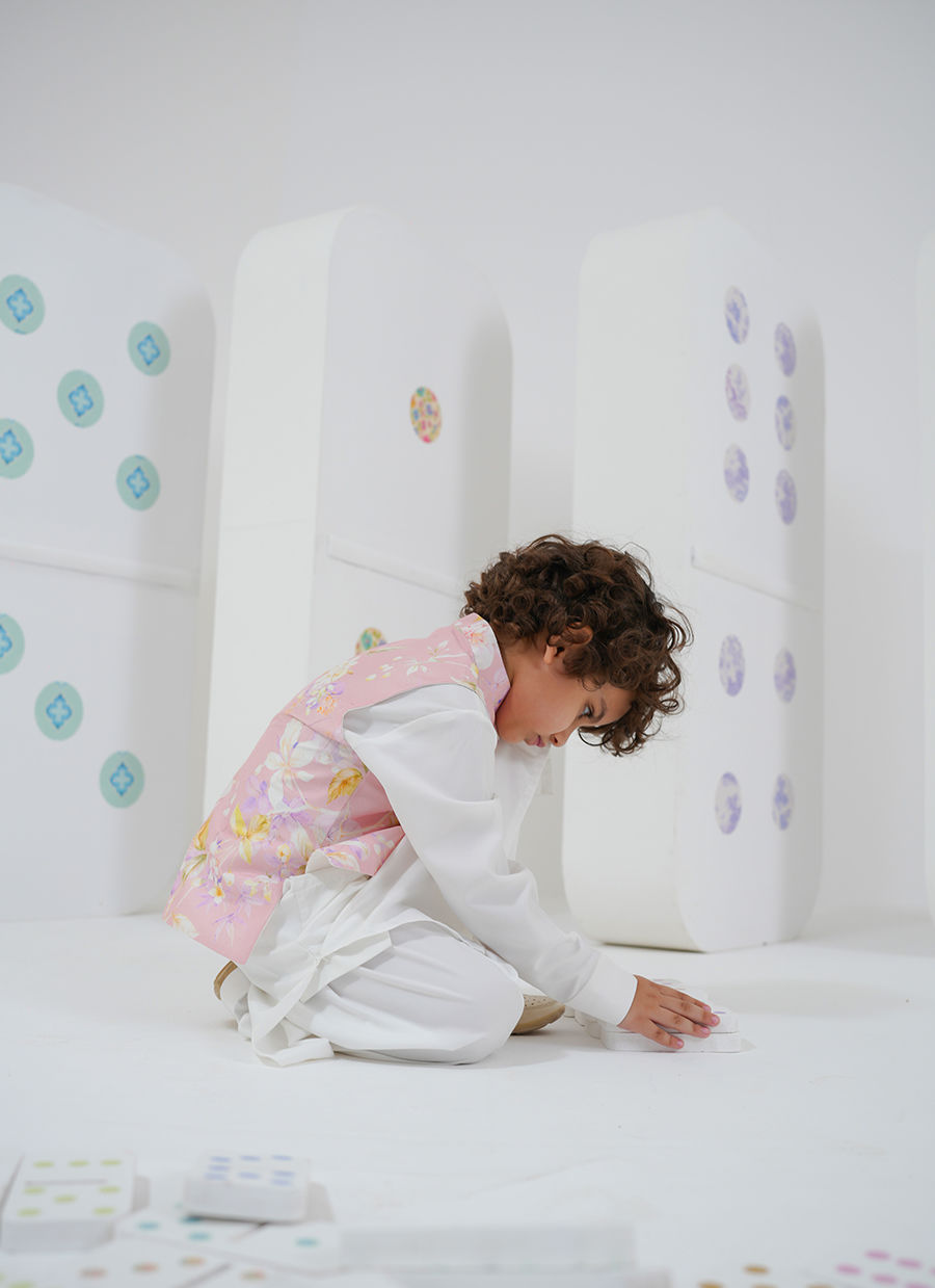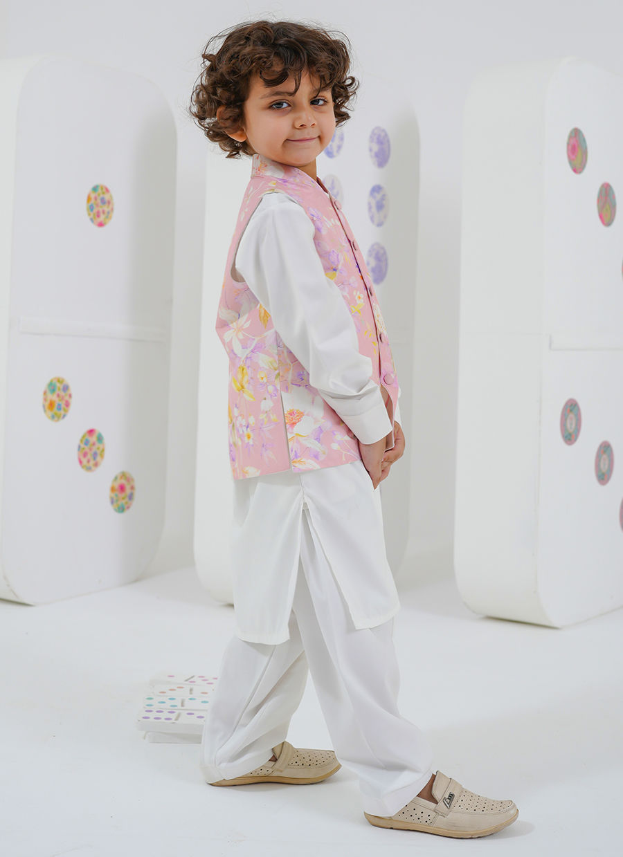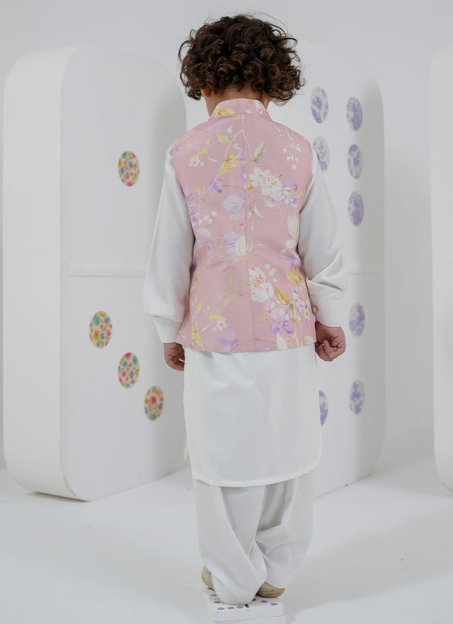A charming counterpart to Cressida Mini, this boys’ set features a soft floral printed waistcoat layered over a classic kurta.
