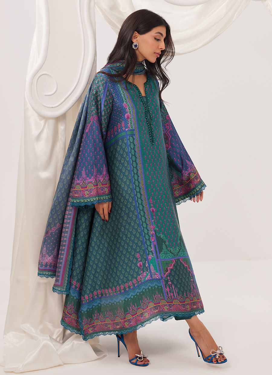 Paired with a solid raw silk izaar and complemented by a printed medium silk dupatta, this ensemble strikes a perfect balance between tradition and modern sophistication. Lightweight yet luxurious.