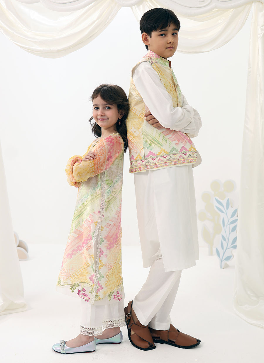 Elara Mini is a graceful pastel ensemble designed for little ones who love soft colors and effortless style. The gentle mix of florals and abstract patterns creates a fresh, playful look, perfect for festive mornings and special family moments.