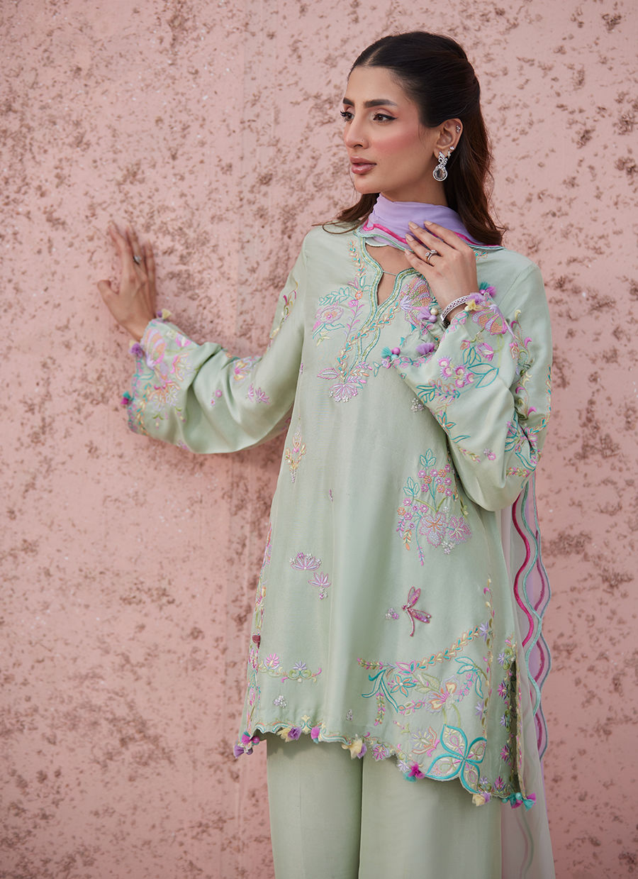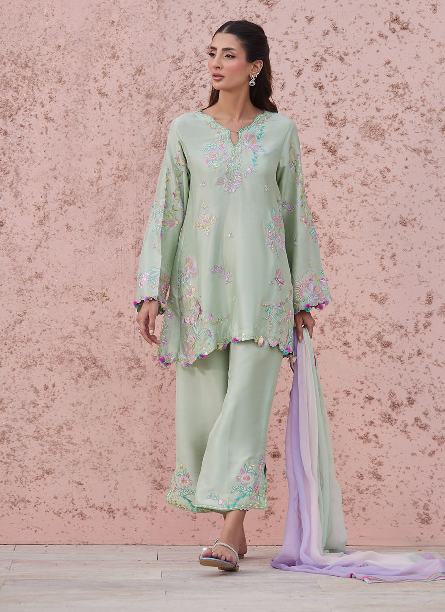 Fresh, airy, and effortlessly modern — Hailee brings a light, playful energy to festive dressing. Set in a soothing mint green tone, this pure raw silk ensemble is designed for ease, movement, and understated charm.