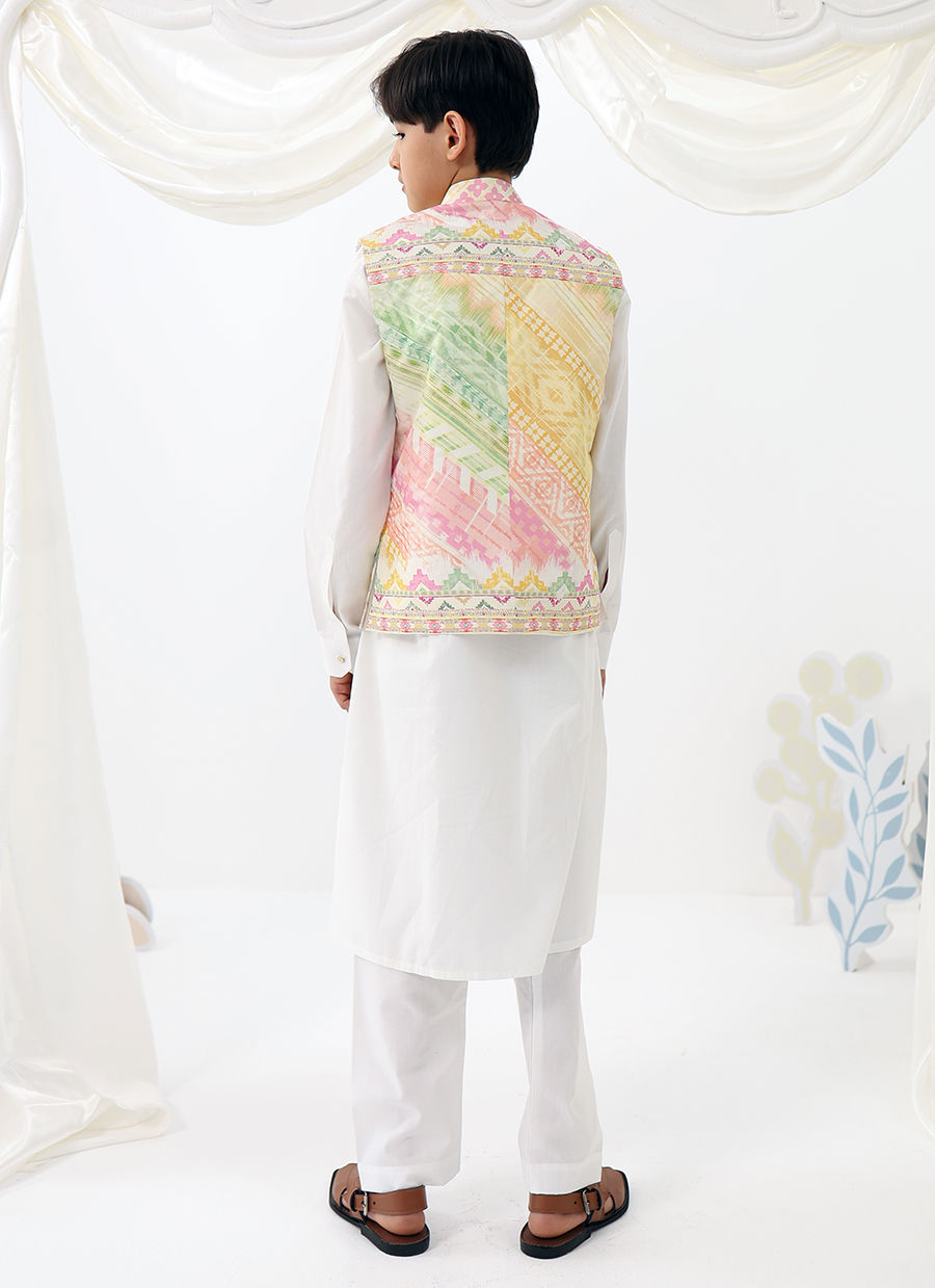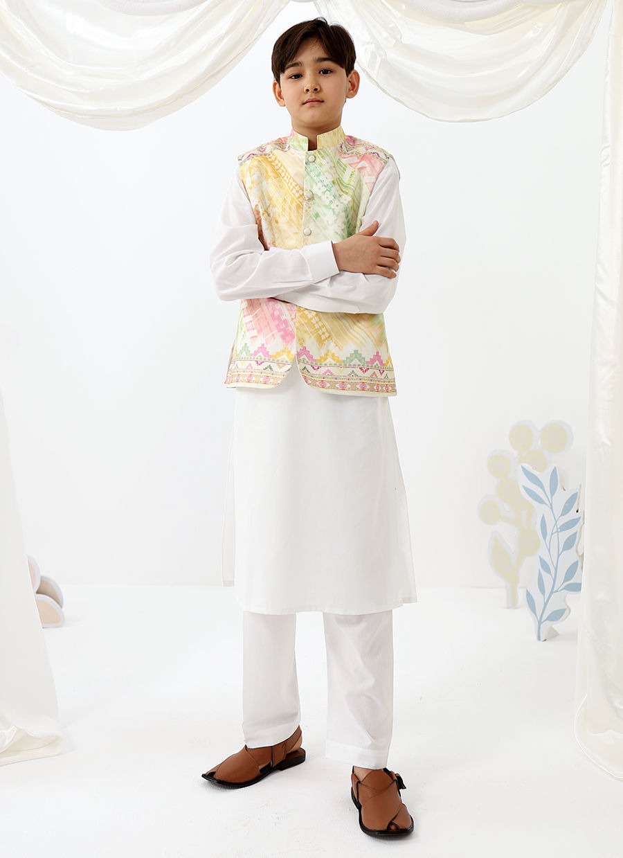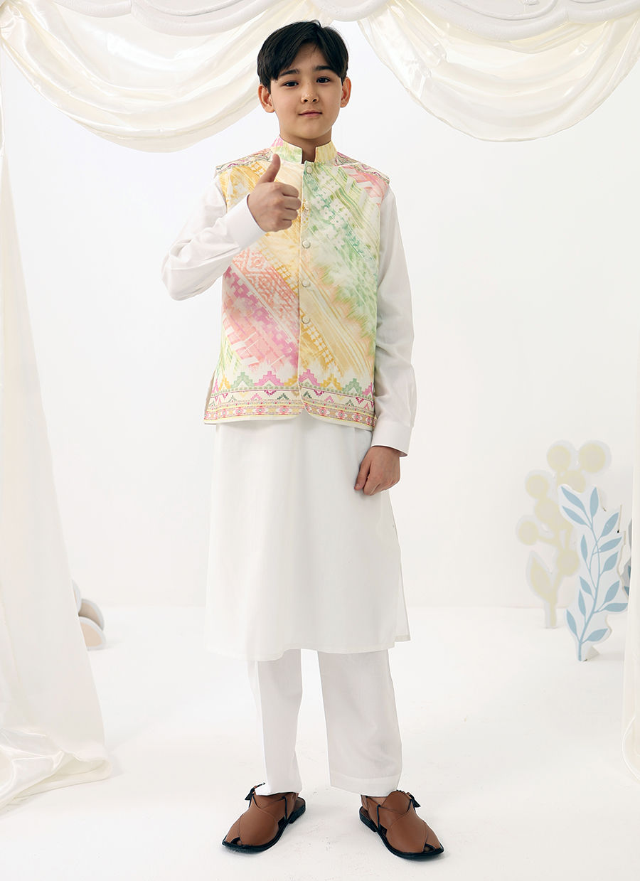 Ilyas Mini is a refined festive look designed for little gentlemen. Featuring a crisp white kurta shalwar paired with a softly printed waistcoat, this ensemble blends traditional charm with a fresh pastel palette for a polished yet playful finish.
