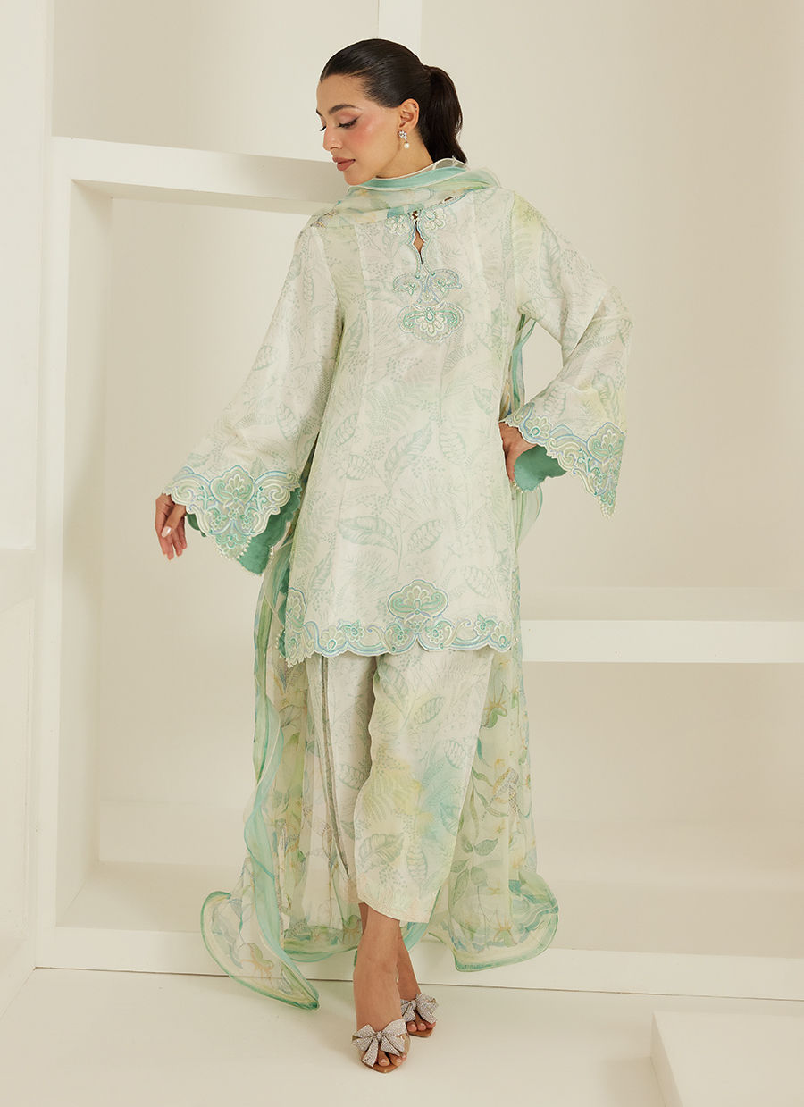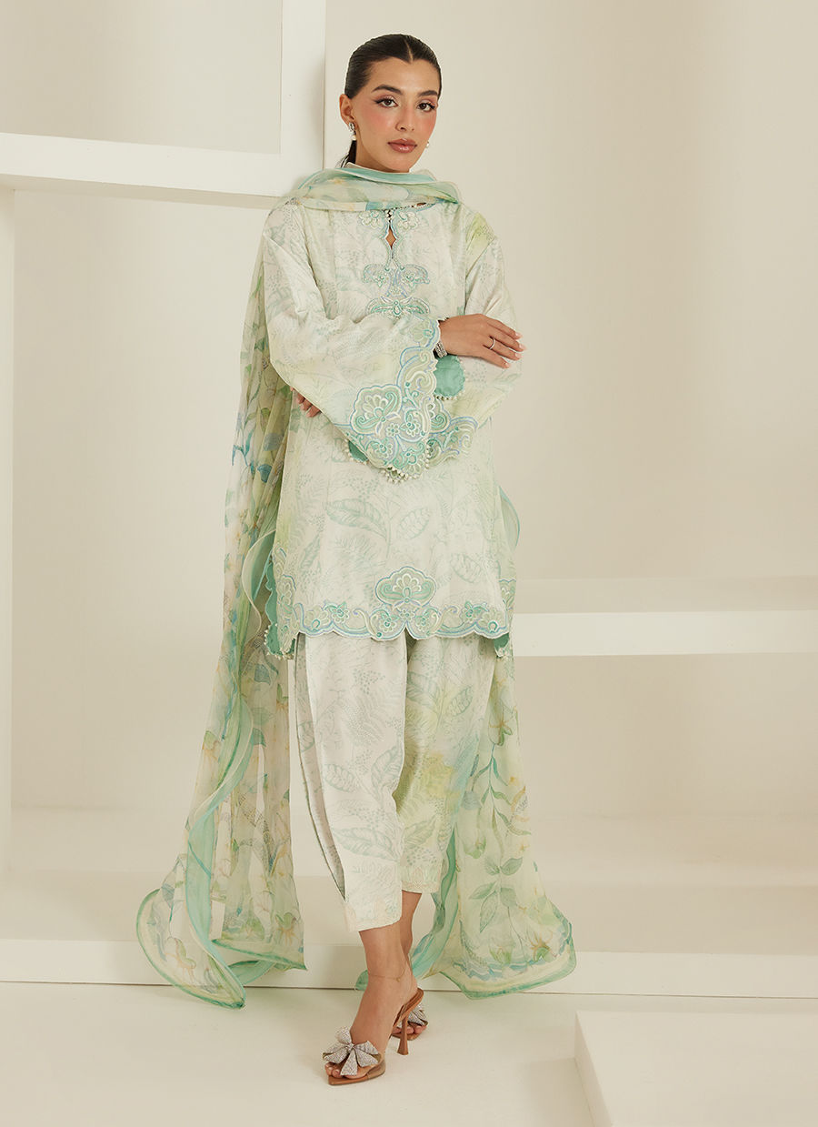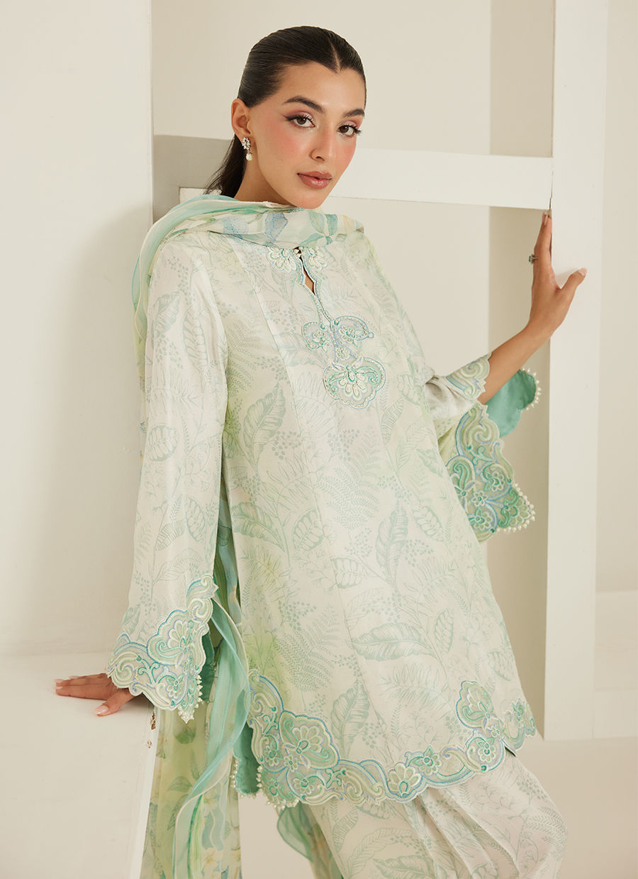 The silhouette is relaxed yet polished, enhanced with intricate embroidery along the neckline and scalloped detailing on the hem and sleeves. Each element is thoughtfully placed, creating a harmonious balance between texture and design. Paired with a sheer, fluid dupatta that drapes effortlessly, the look feels light, graceful, and endlessly feminine.