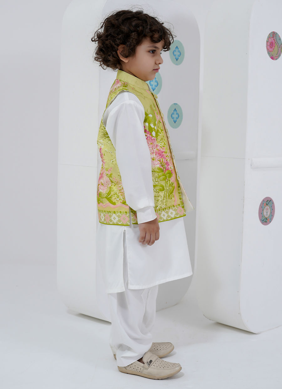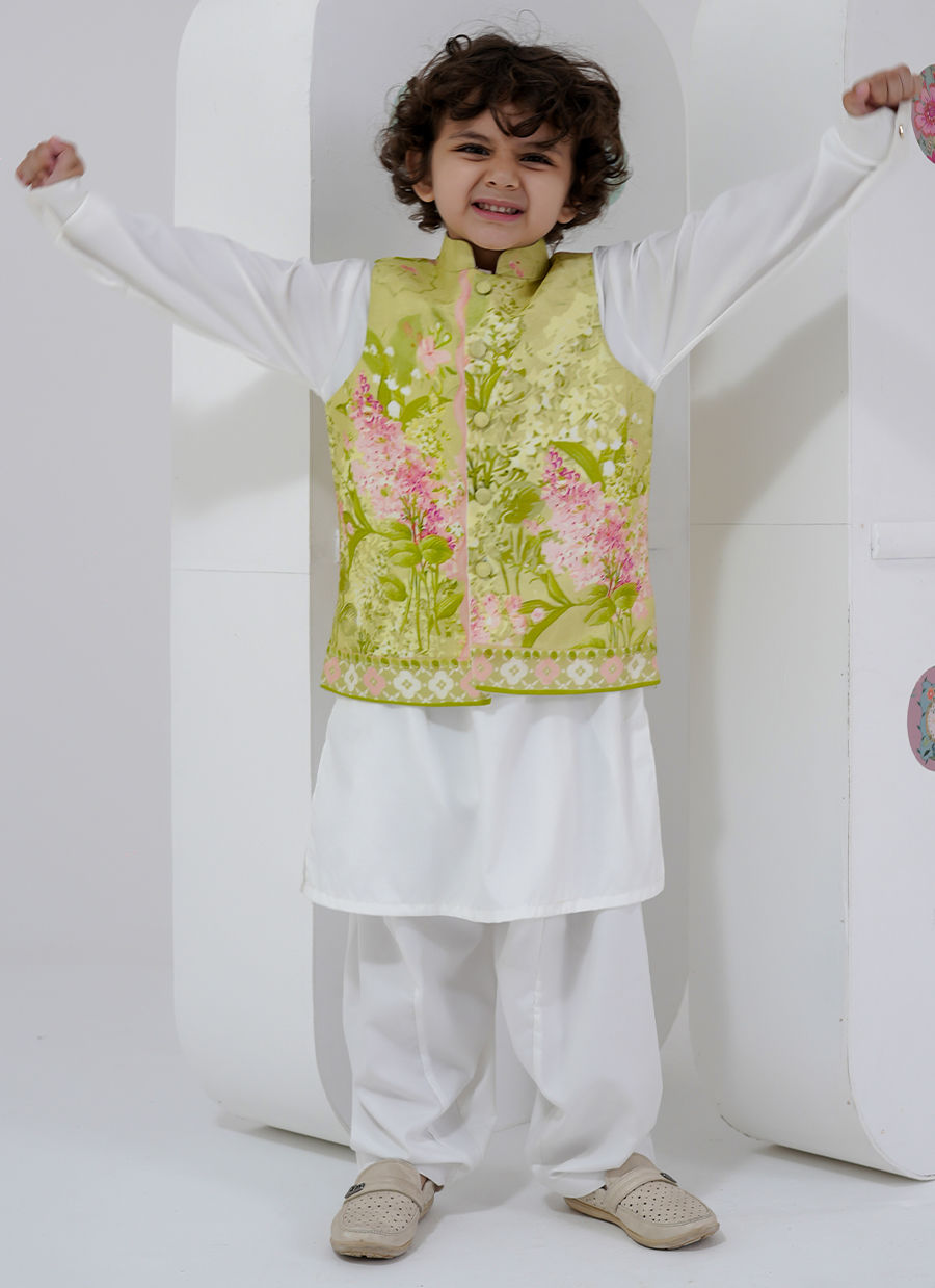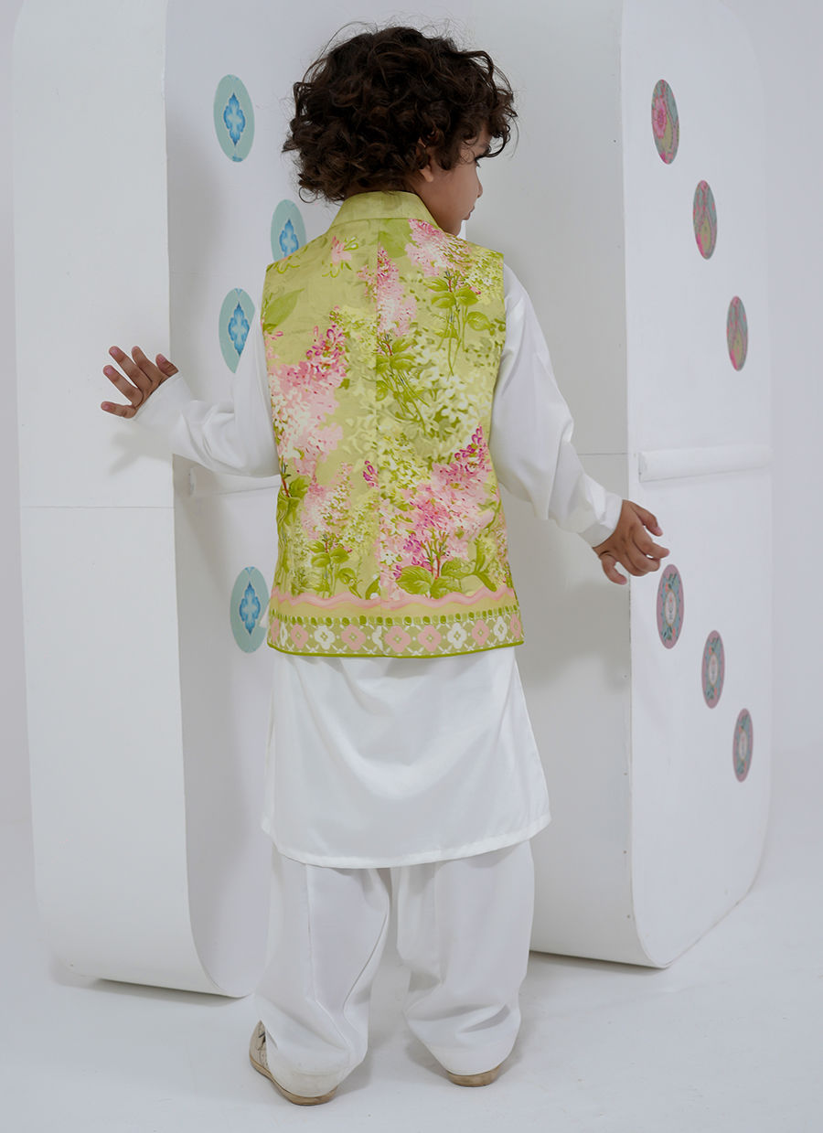 A lively counterpart to Malone Mini, this boys’ set features a printed waistcoat in fresh lime tones layered over a classic white kurta.