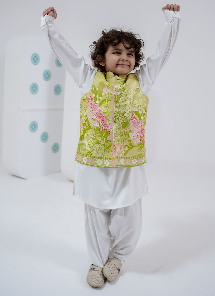 A lively counterpart to Malone Mini, this boys’ set features a printed waistcoat in fresh lime tones layered over a classic white kurta. Designed for playful sophistication, it brings together festive charm with everyday comfort.