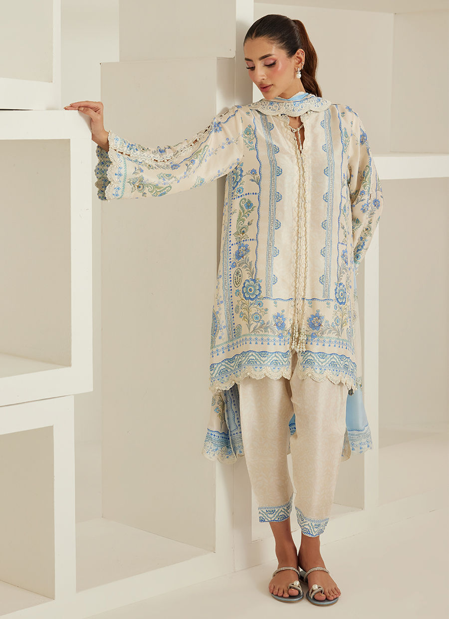 The silhouette flows with quiet ease, offering a relaxed yet polished structure. Fine detailing along the neckline and subtle lace finishes add a layer of softness, while the carefully framed borders lend a sense of balance and definition. Paired with a lightweight dupatta that drapes gently and coordinating pants that complete the look, the ensemble feels cohesive and graceful.