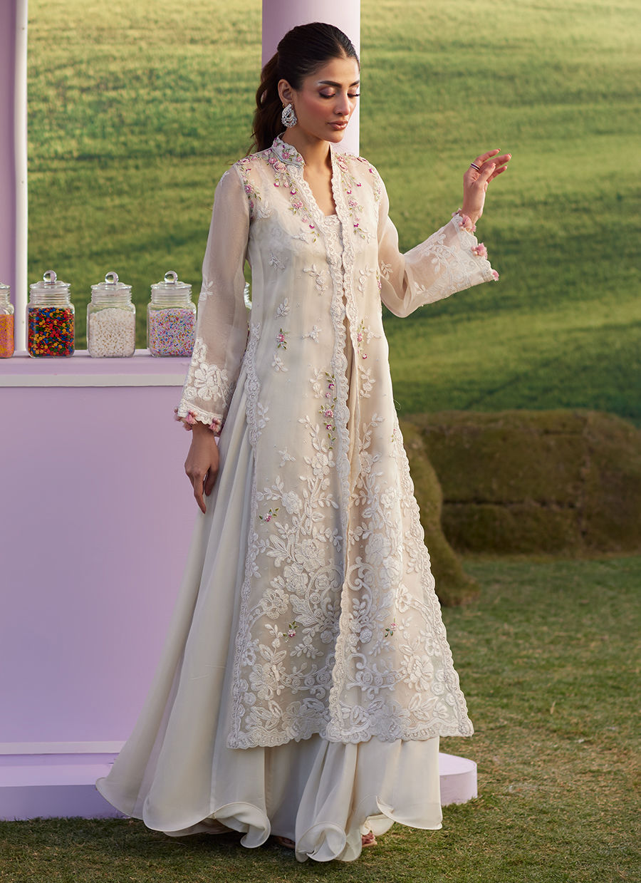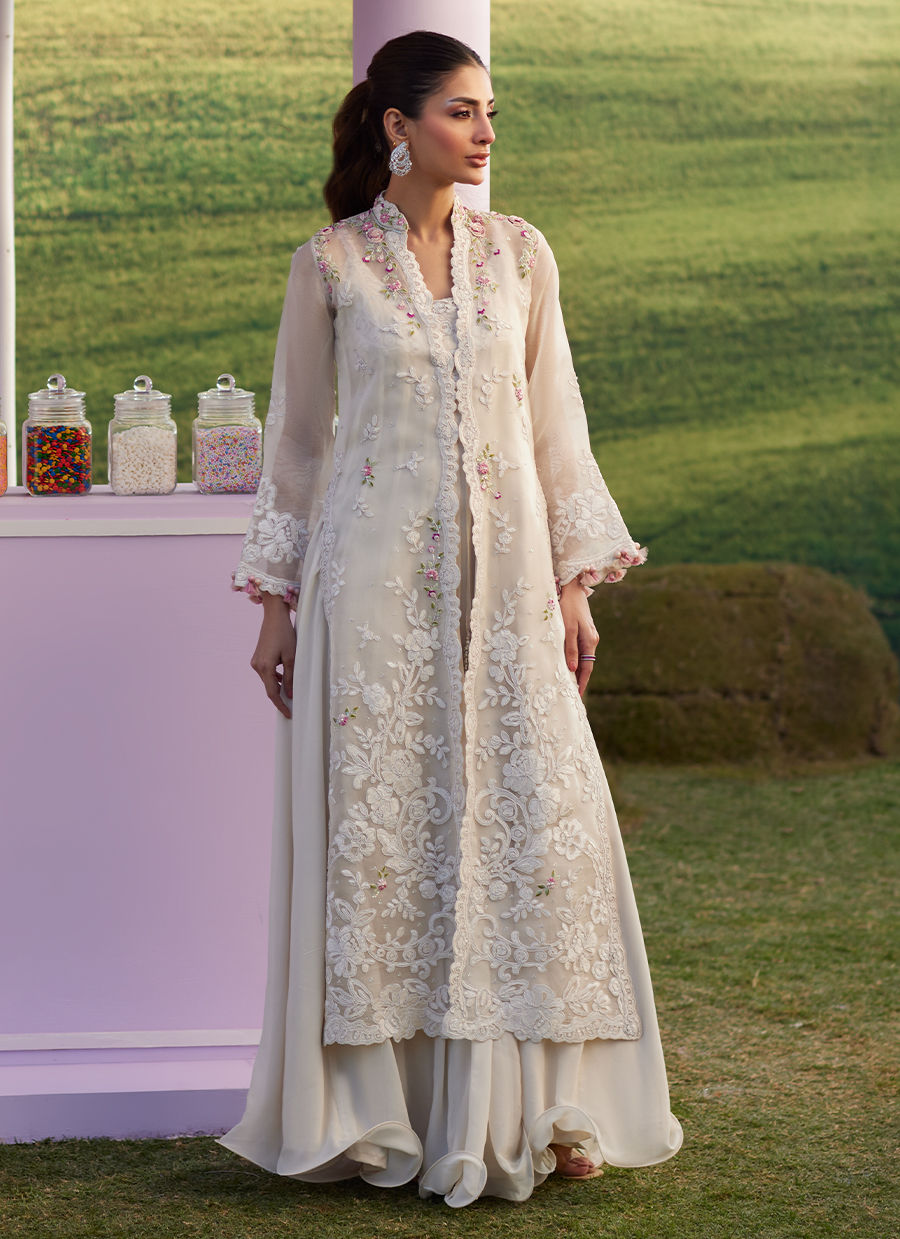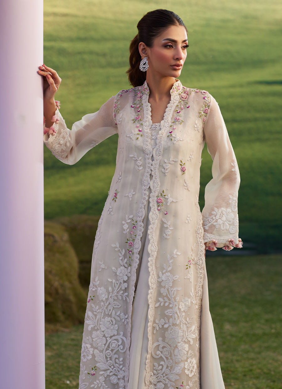 Bask in the glow of subtle sophistication with Melia — a delicate statement designed for the most special celebrations. This ethereal off-white organza jacket is beautifully embroidered with resham and cord work, further elevated with intricate 3D flowers, petals, sequins, and cut glass beads in soft shades of pastel pinks and greens. Layered over a flowing inner chiffon dress, featuring matching embroidery around the neckline, this ensemble feels effortlessly graceful and timeless — perfect for Eid festivities, intimate gatherings, and elegant evenings.