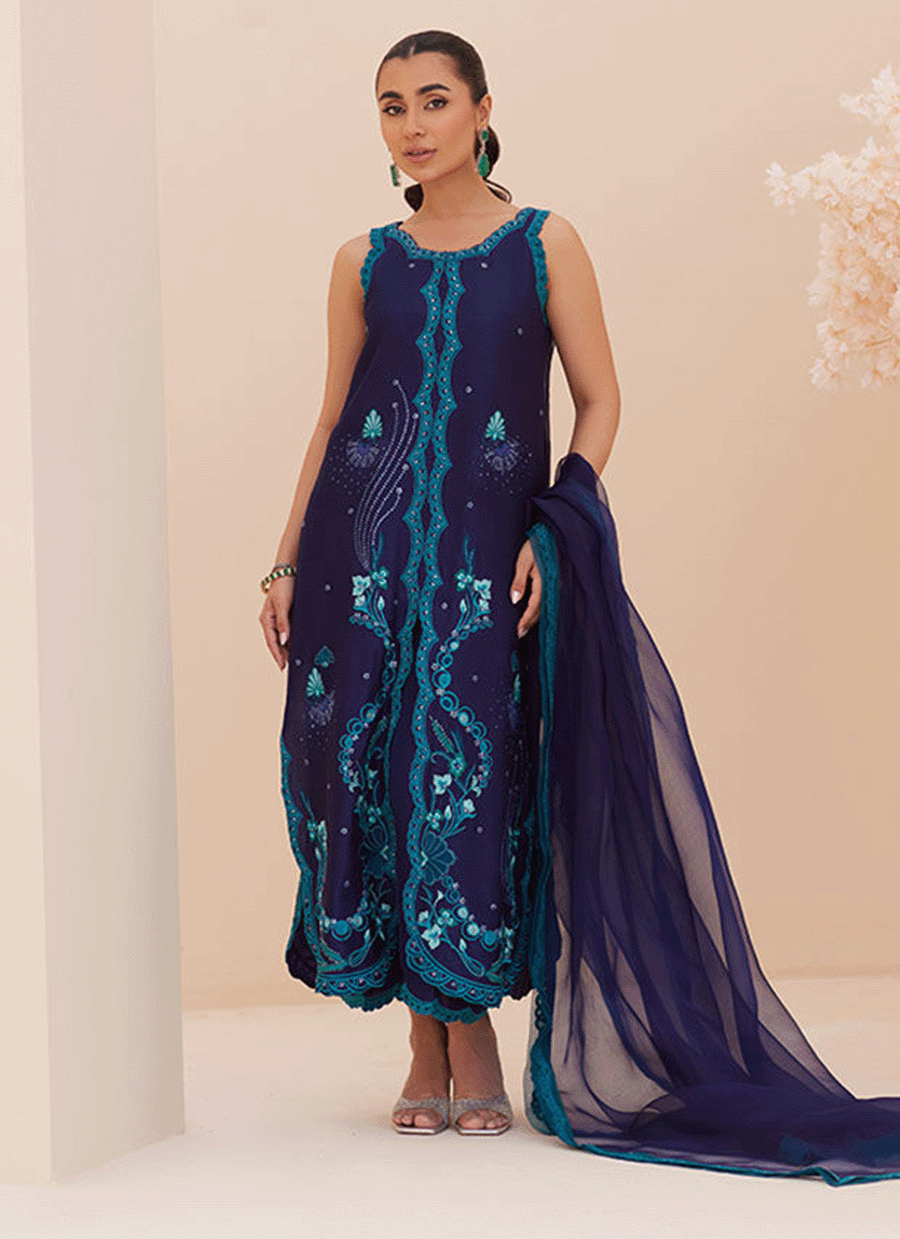 Don’t miss out on the timeless elegance and unmatched versatility of the Rio ensemble.Beautifully crafted from pure, ink blue cotton net, the Rio ensemble strikes the perfect balance between elegant and eye-catching.A timeless, forever flattering silhouette, is adorned with silk threadwork in pristine ivory with pops of turquoise, aqua and deep teal florals. Generously embroidered all over, with a hand cut scallops, this shirt is an utterly romantic ensemble, especially created for you to fall for time and again. The gorgeous organza dupatta with lavishly embroidered scalloped borders on all four sides, completes your ensemble.Pair with our coordinating pants (as pictured) and minimal accessories for a real glam vibe All RTS outfits come with complimentary sleeves