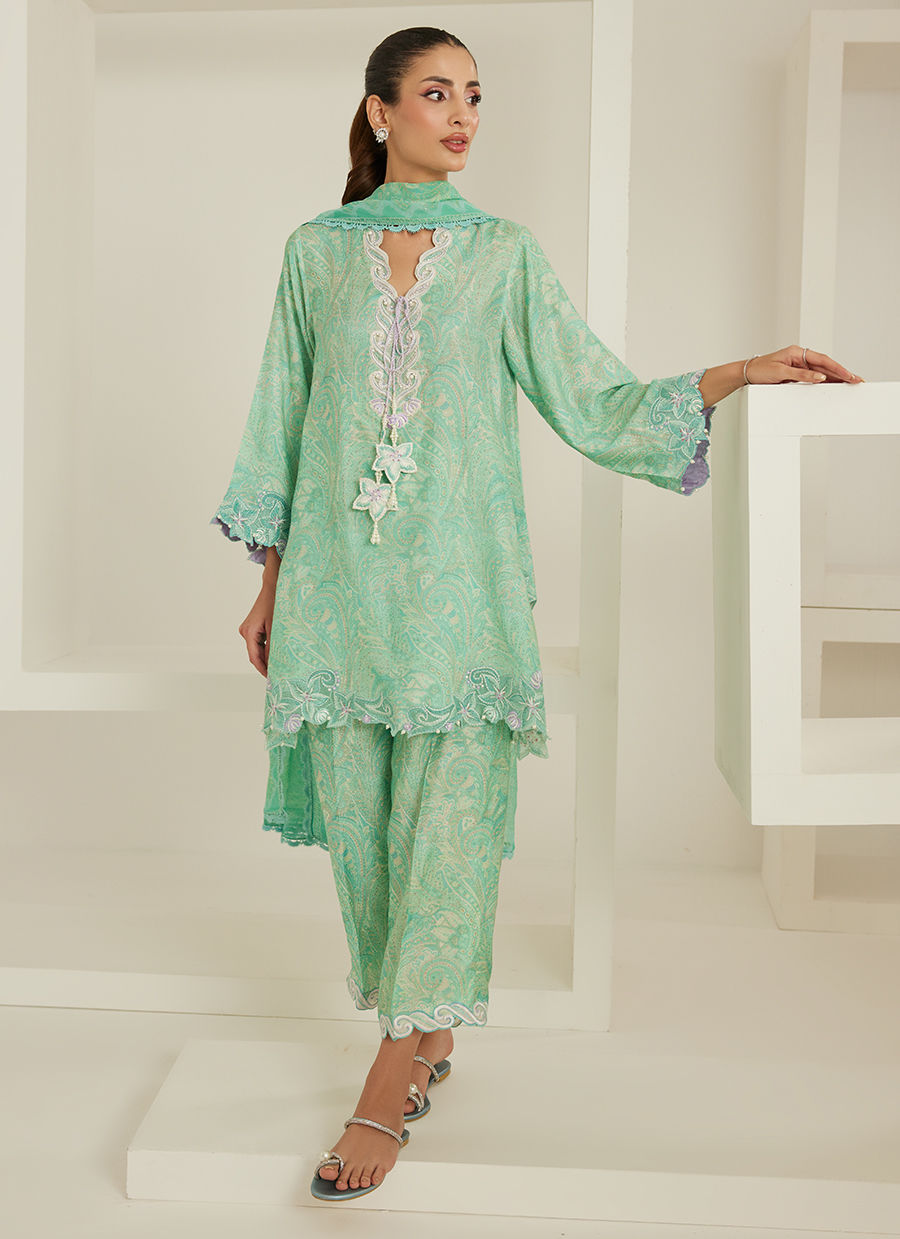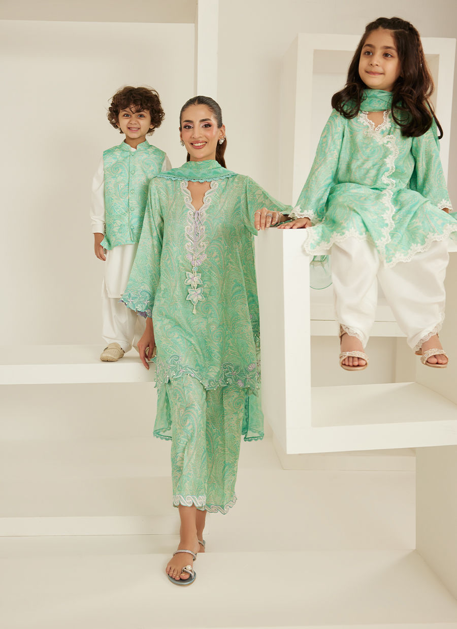 Soft, serene, and effortlessly graceful — Sabrina is a vision of understated luxury. Crafted in pure raw silk, this ensemble carries a delicate printed canvas in a refreshing mint hue, brought to life with intricate ivory embroidery along the neckline, sleeves, and hem.