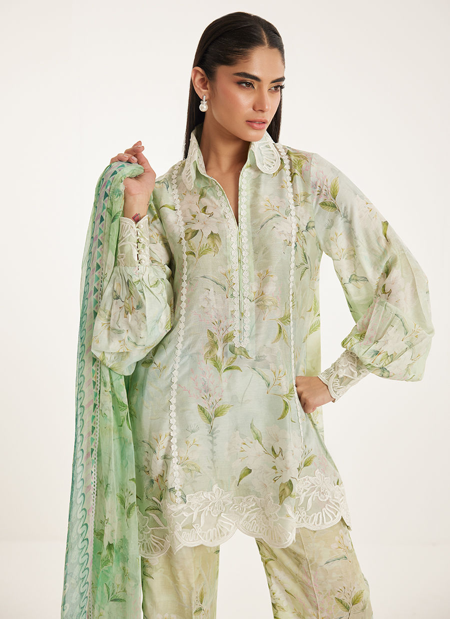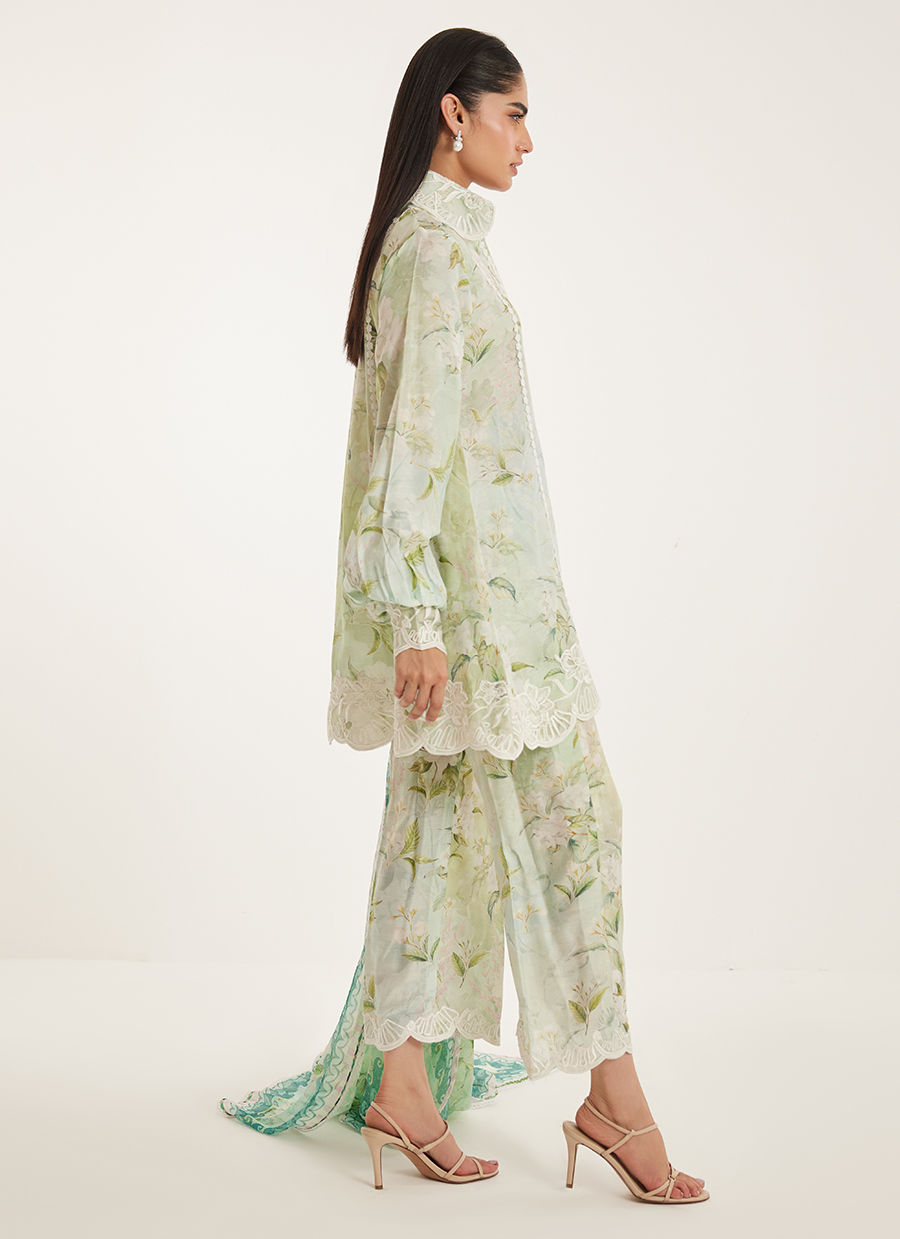 Intricate lace detailing along the hem and neckline adds a subtle layer of craftsmanship, while the airy sleeves bring a sense of ease and softness to the look. Paired with a flowing dupatta that trails beautifully, the ensemble feels light, graceful, and naturally elegant.