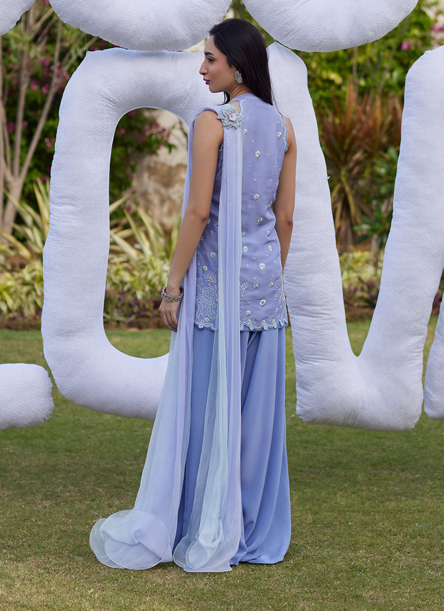 Paired with fluid, wide-leg pants, the silhouette feels relaxed yet polished, offering comfort without compromising on style. The airy chiffon dupatta completes the look, adding movement and a soft, flowing contrast.