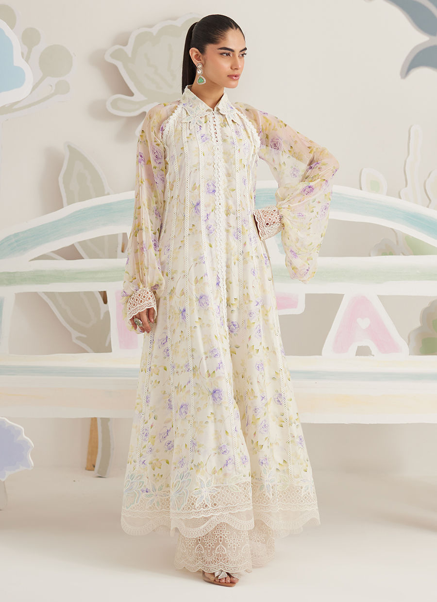 Light, graceful, and quietly romantic, Veya is designed for moments that call for effortless refinement. The flowing silhouette is crafted in a sheer, printed fabric that moves beautifully with every step, while delicate lace accents lend a soft sense of structure. The subtle floral placement keeps the look airy and composed, making it ideal for relaxed festive dressing.