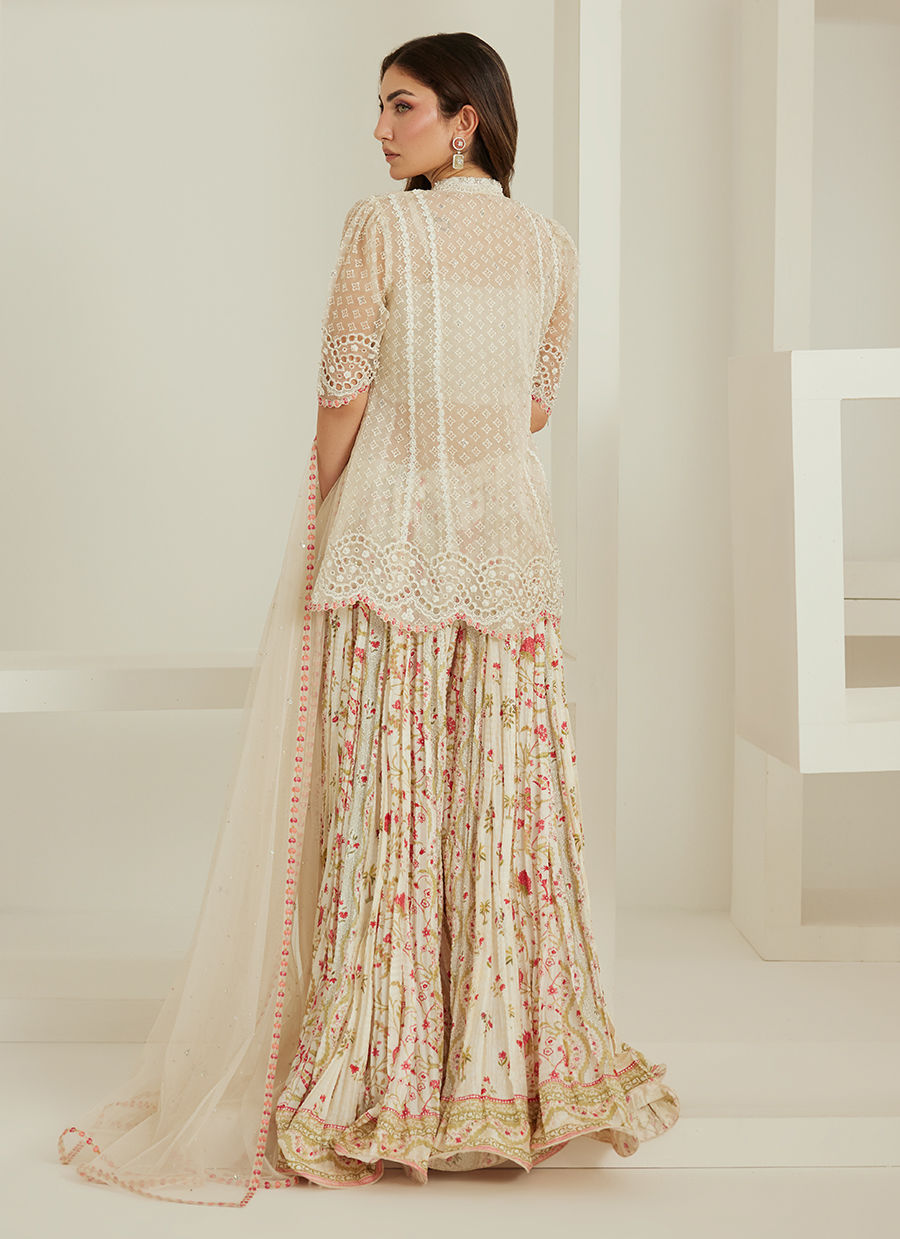 Paired with fluid, printed crushed pants that add movement and texture, the silhouette strikes a perfect balance between structure and softness. The sheer dupatta, subtly finished and weightless in drape, completes the ensemble with a touch of understated charm.